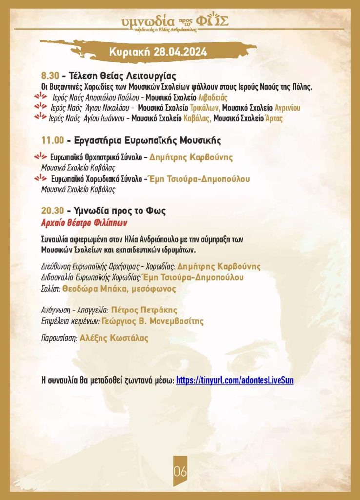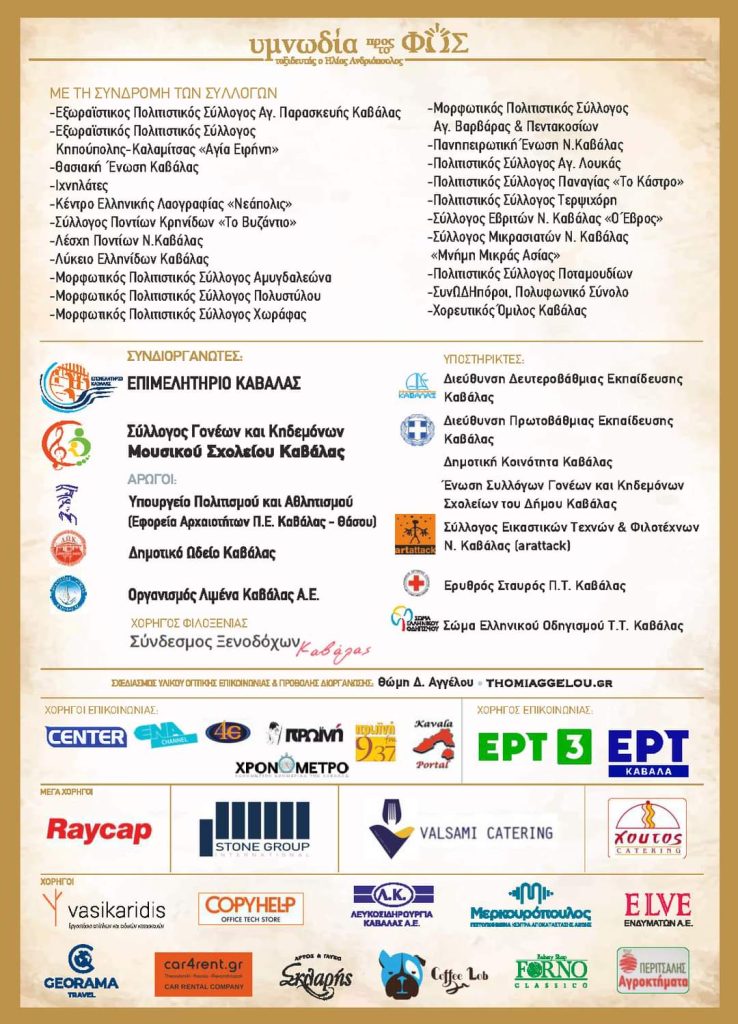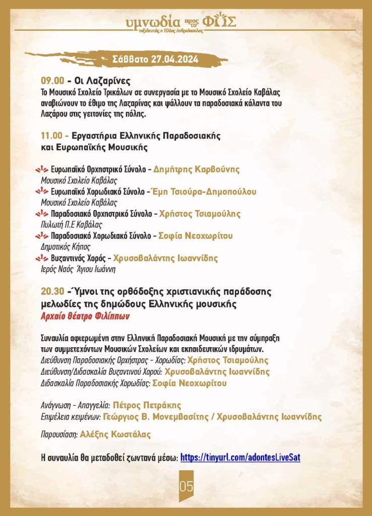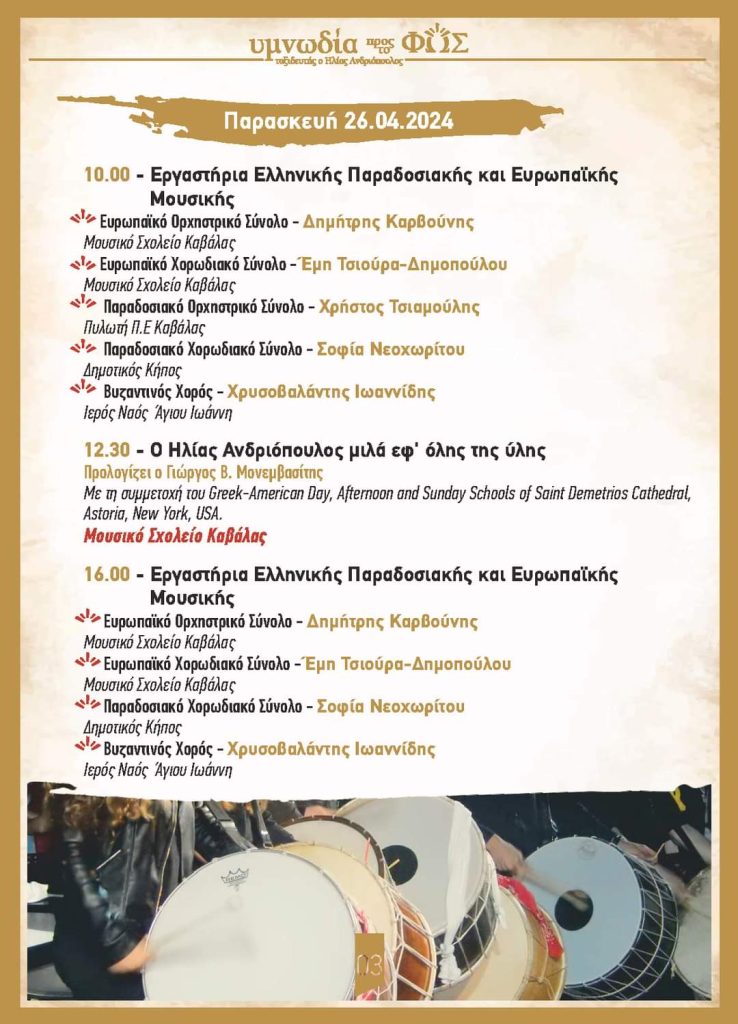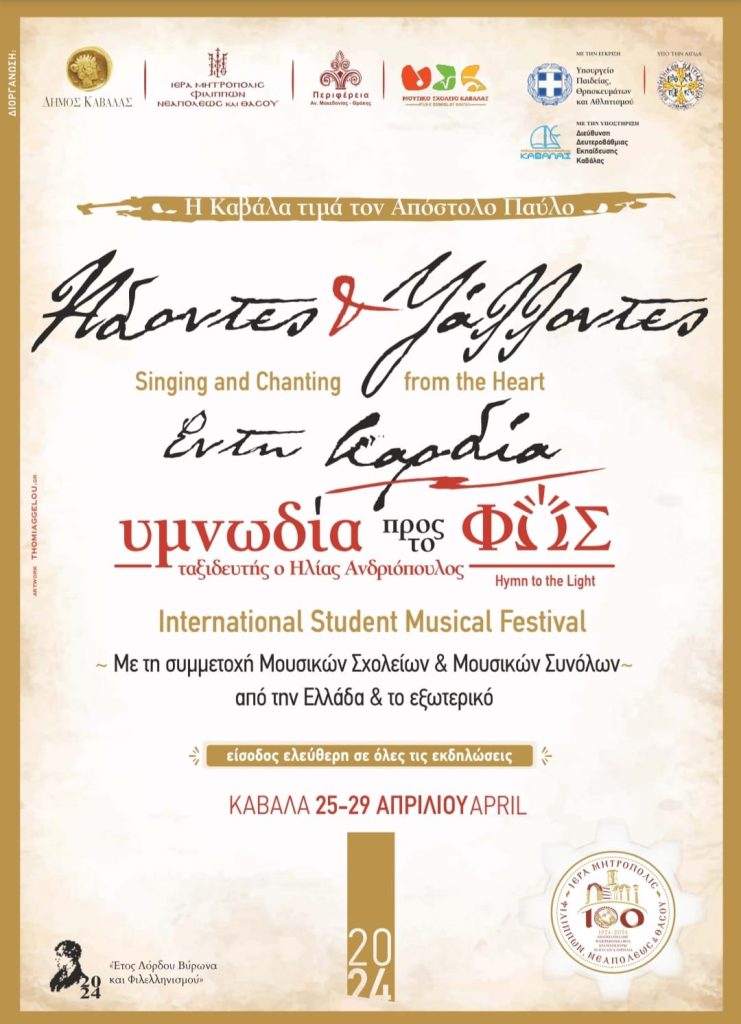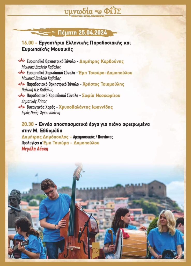 Το φετινό φεστιβάλ,που φέρει τον γενικό τίτλο: “Υμνωδία προς το φως”, περιλαμβάνει μία συναυλία αφιερωμένη στον Ηλία Ανδριόπουλο, ύμνους της ορθόδοξης χριστιανικής παράδοσης, μελωδίες της δημώδους ελληνικής μουσικής, εργαστήρια ελληνικής παραδοσιακής και ευρωπαϊκής μουσικής, μία εκδήλωση κατά της ενδοσχολικής βίας, τα κάλαντα του Λαζάρου στις γειτονιές της πόλης και την τέλεση θείας λειτουργίας από τις βυζαντινές χορωδίες των μουσικών σχολείων στους ιερούς ναούς της Καβάλας.