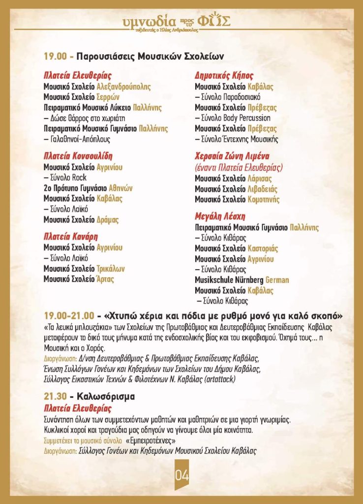 Το φετινό φεστιβάλ,που φέρει τον γενικό τίτλο: “Υμνωδία προς το φως”, περιλαμβάνει μία συναυλία αφιερωμένη στον Ηλία Ανδριόπουλο, ύμνους της ορθόδοξης χριστιανικής παράδοσης, μελωδίες της δημώδους ελληνικής μουσικής, εργαστήρια ελληνικής παραδοσιακής και ευρωπαϊκής μουσικής, μία εκδήλωση κατά της ενδοσχολικής βίας, τα κάλαντα του Λαζάρου στις γειτονιές της πόλης και την τέλεση θείας λειτουργίας από τις βυζαντινές χορωδίες των μουσικών σχολείων στους ιερούς ναούς της Καβάλας.
