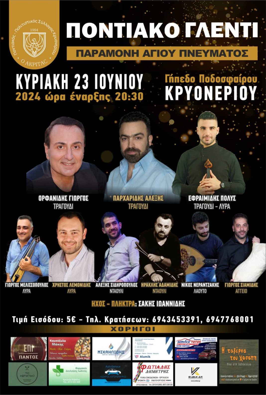 Ο Ποντιακός – Πολιτιστικός Σύλλογος Κρυονερίου “Ο ΑΚΡΙΤΑΣ” ανακοινώνει ότι την Κυριακή 23 Ιουνίου 2024 & ώρα 20:30 στο Γήπεδο Ποδοσφαίρου Κρυονερίου, θα πραγματοποιήσει το ετήσιο πανηγύρι για τον εορτασμό του Αγίου Πνεύματος και της ενορίας του χωριού μας!