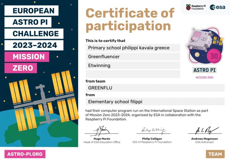 Ολοκληρώθηκε με επιτυχία το πρόγραμμα eTwinning με τίτλο “GREENFLUENCER” που υλοποιήθηκε από τους μαθητές και τις μαθήτριες της Δ και Ε τάξης του Δ. Σ. Φιλίππων σε συνεργασία με τους μαθητές και τις μαθήτριες από 6 σχολεία της Τουρκίας, 1 σχολείο της Ρουμανίας , 1 σχολείο της Ελλάδας. Το πρόγραμμα ξεκίνησε τον Νοέμβριο του 2023 και ολοκληρώθηκε το Μάιο του 2024. Συμμετείχαν 9 εκπαιδευτικοί και 85 μαθητές. Τα παιδιά ανέπτυξαν δεξιότητες για της οικολογία, προστασία του περιβάλλοντος, φαινόμενο θερμοκηπίου, έγραψαν κώδικα στην python, micro:bit και μελέτησαν την υγρασία του εδάφους, ακόμη υλοποίησαν προγράμματα της eesa NASA όπως eesa climate, έπαιξαν Kahoot! με θέμα την ανακύκλωση, κατασκεύασαν κοσμήματα με κουκούλια μεταξοσκώληκα. Υλοποίησαν δράσεις για την παγκόσμια ημέρα του νερού, παγκόσμια ημέρα της γης και την ημέρα etwinning, έγραψαν και κατασκεύασαν δικό τους τραγούδι χρησιμοποίησαν την Τεχνητή Νοημοσύνη ΑΙ. για την μουσική.