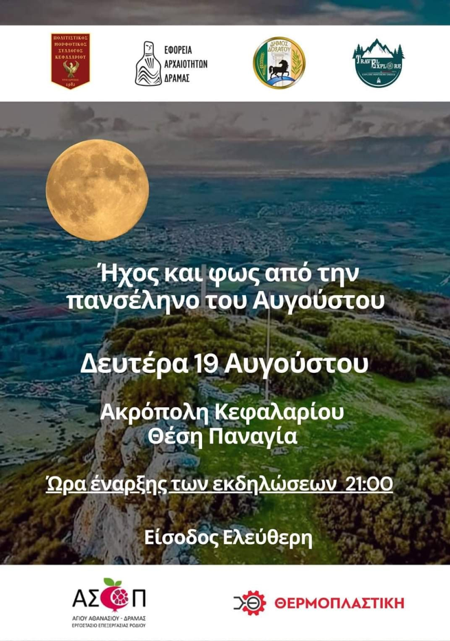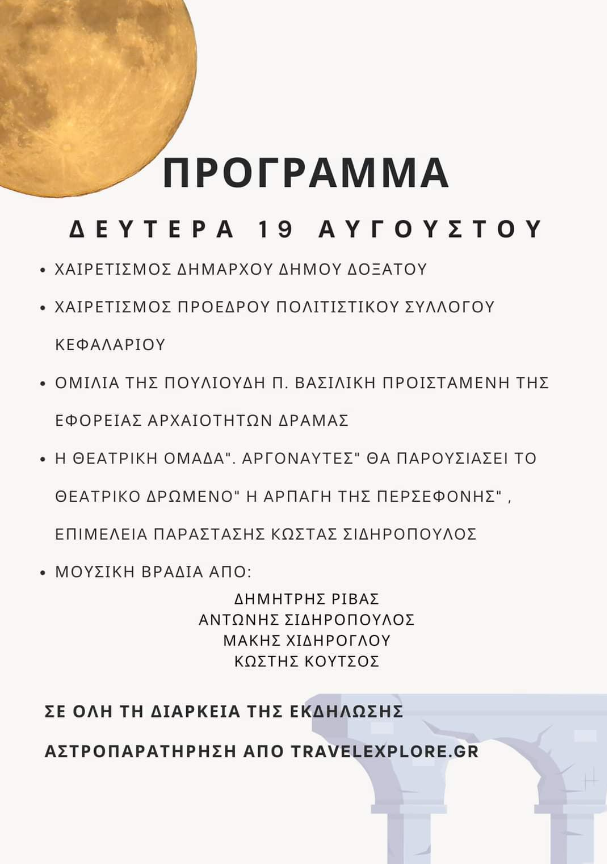 Η θεατρική ομάδα «Αργοναύτες» θα παρουσιάσει το θεατρικό δρώμενο με τίτλο: «Η Αρπαγή της Περσεφόνης» σε επιμέλεια Κώστα Σιδηρόπουλου. Την εκδήλωση παρουσιάζει ο Πολιτιστικός Σύλλογος Κεφαλαρίου, σε συνεργασία με το Δήμο Δοξάτου και φυσικά την Εφορεία Αρχαιοτήτων Δράμας. Ήχος και φως από την πανσέληνο του Αυγούστου την Δευτέρα 19 Αυγούστου στην Ακρόπολη Κεφαλαρίου στη Θέση Παναγία.