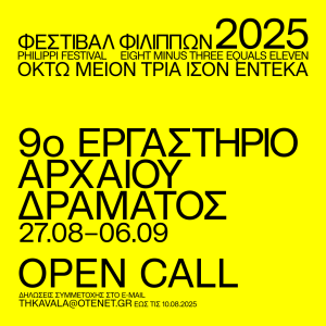 Το 68ο Φεστιβάλ Φιλίππων, εντάσσει και φέτος στις συνολικές του παρουσιάσεις έναν πολύ σημαντικό θεσμό, που τα τελευταία χρόνια δίνει μια νέα πνοή στην ευρύτερη περιοχή του Αρχαίου θεάτρου, το 9ο Εργαστήριο Αρχαίου Δράματος. Ένα ερευνητικό δημιουργικό camp που διεξάγεται στην περιοχή των Κρηνίδων, και τοποθετεί στο κέντρο του την όλη διαδικασία της μάθησης, επιτρέποντας συνολικά ένα νέο ανανεωτικό βλέμμα πάνω στο Αρχαίο Δράμα.