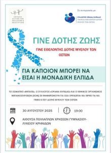 Το Σωματείο Ένταξις, σε συνεργασία με τον Σύλλογο ΌΡΑΜΑ ΕΛΠΙΔΑΣ” και τον Εθνικό Οργανισμό Μεταμοσχεύσεων (ΕΟΜ), σας προσκαλεί σε μια σπουδαία εθελοντική εκδήλωση αφιερωμένη στη δωρεά μυελού των οστών, στις 30 Αυγούστου, στις 19:00, στην αίθουσα πολλαπλών χρήσεων του Γυμνασίου – Λυκείου Κρηνίδων.