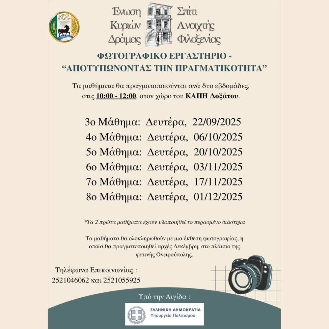 Ο Δήμος Δοξάτου, σε συνεργασία με την Ένωση Κυριών Δράμας – Σ.Α.Φ. και υπό την αιγίδα του Υπουργείου Πολιτισμού, υλοποιεί το εργαστήριο φωτογραφίας «Αποτυπώνοντας την Πραγματικότητα».