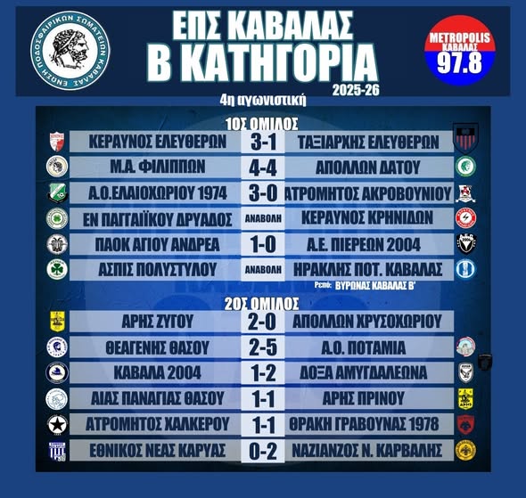 Η 4η αγωνιστική της ΕΠΣΚ Καβάλας στην Α΄ κατηγορία καθώς και στους δύο ομίλους της Β΄ κατηγορίας