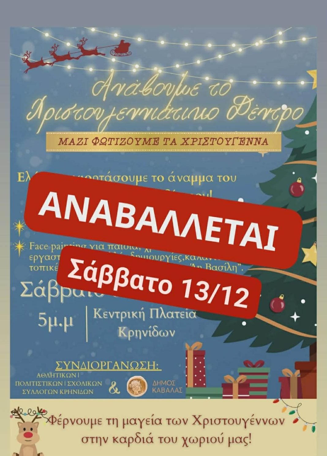 Ανάβουμε το χριστουγεννιάτικο δέντρο στην πλατεία Πελεκανίδη στις Κρηνίδες το Σάββατο 13 Δεκεμβρίου.